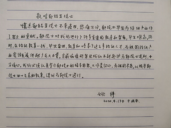 1.敬唁郁铭芳院士 惊悉郁铭芳院士不幸离世,悲痛万分。郁院士毕生为纺织产业作出了巨大的贡献。郁院士对我也进行了许多重要的教导和帮助,毕生难忘。同时,在纺织教育一线,毕生奋进,教育和培养了这么多纺织人才,为祖国纺织产业宏伟发展贡献了巨大力量。当前病疫形势使我们不能赴沪为郁院士送别,十分痛心。我们必须认真学习郁院士的指导思想、工作责任心,为祖国尽忠,以报答郁院士四十年来的教育。请代为郁院士送行。