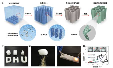 (图1弹性陶瓷纳米纤维气凝胶的(a)制备流程示意图,(b)不同形状样品,(c)超轻质特性,(d)耐高温性能,(e)大形变下压缩回复性能)