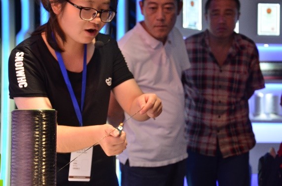 讲解员们先为大家介绍了重点实验室的科研历史和科研地位,使大家初步了解了材料公司在服务传统化学纤维工业升级改造中发挥着生力军的作用,随后又介绍了成果展示室中陈列的涤纶、锦纶、碳纤维等纤维材料,并表示公司开展了在通用纤维材料多功能、纳米结构纤维、低维材料结构调控与功能化的研究,并攻克了多项行业共性核心技术。以及通过例举生活中简单易懂的列子详细的介绍了聚乙烯缆绳,防弹衣,隔热消防服等等成果背后的科技含量,让大家感受到了科学的魅力。
