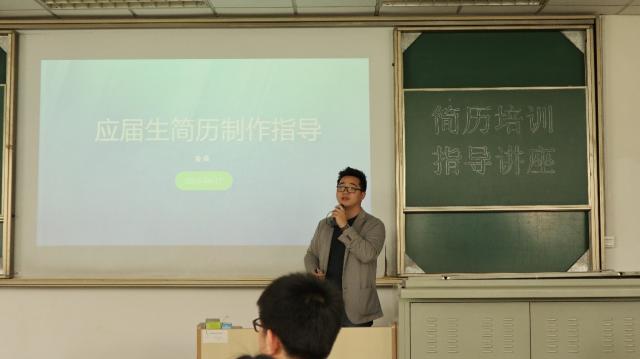 然后金鑫老师为同学们讲解了简历内容的具体格式、注意事项和投递简历的主要方式,推荐了常用的简历模板,并分析了上次求职模拟大赛中的优秀简历供同学们比较参考。