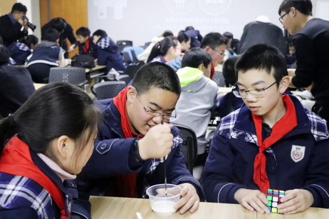 最后,小朋友们学习了恢复三阶魔方的小技巧,并在老员工的帮助下,用淀粉和水制作了“非牛顿流体”。活动结束,负责成员将会议室恢复整洁,并送孩子们离开材料楼。小朋友说以后要像非牛顿流体一样遇强则强,不怕困难,努力学习,处处留心生活中的材料,怀揣科学的精神去探索生活的点点滴滴。