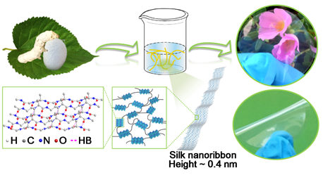 “材料之王”石墨烯是目前最薄、最强的材料,单层石墨烯的厚度仅有0.34纳米。然而,你也许不知道传承了几千年的蚕丝也是由厚度仅为0.4纳米的丝素纤维带有序组装而成的,可谓“纳米丝带”。丝巾中一根蚕丝的直径,大约等于三万多层丝素纳米纤维带叠加起来的厚度。