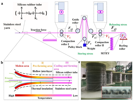 在本工作中,研究人员利用工业级的纺丝设备实现了可拉伸摩擦发电纱线的连续化与规模化生产。此类发电纱线由高弹性聚合物材料(橡胶)与螺旋金属纤维构成,这两类本征弹性体与非本征弹性体通过皮芯结构的设计合二为一,具有协同应变行为。发电纱线在拉伸、弯曲、扭曲等应变下,内部两类材料间发生电子转移,可产生毫瓦级的输出功率。