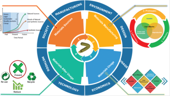 (电极材料的可持续预测方法及其所需性能:从材料的来源、生产、使用到最终消耗,外圈显示了影响电极材料可持续性的因素)