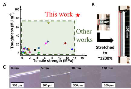 自愈合材料是一种“有生命”的材料,在损伤后,能够像人类的皮肤一样自行愈合,恢复其原有的结构和功能,可以大大延长材料的使用寿命、提高材料的使用安全性、降低材料的维护成本。因此,自愈合材料在汽车涂层、可穿戴电子、软体机器人、生物医学等诸多领域备受关注。然而,已报道的自愈合材料往往需要外界刺激(比如加热、激光、压力等)来激发愈合过程,同时力学和自愈合性能难以兼顾,研制理想的高强韧室温自愈合材料仍然是该领域的挑战。