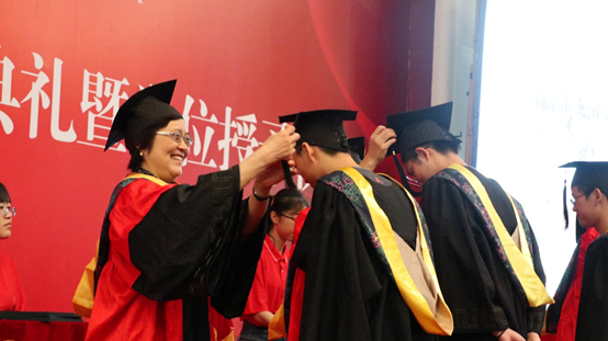 伴随着庄严的背景音乐,公司党政领导及教师为全体2019届本科毕业生正冠拨穗,颁发学位证书并合影留念。