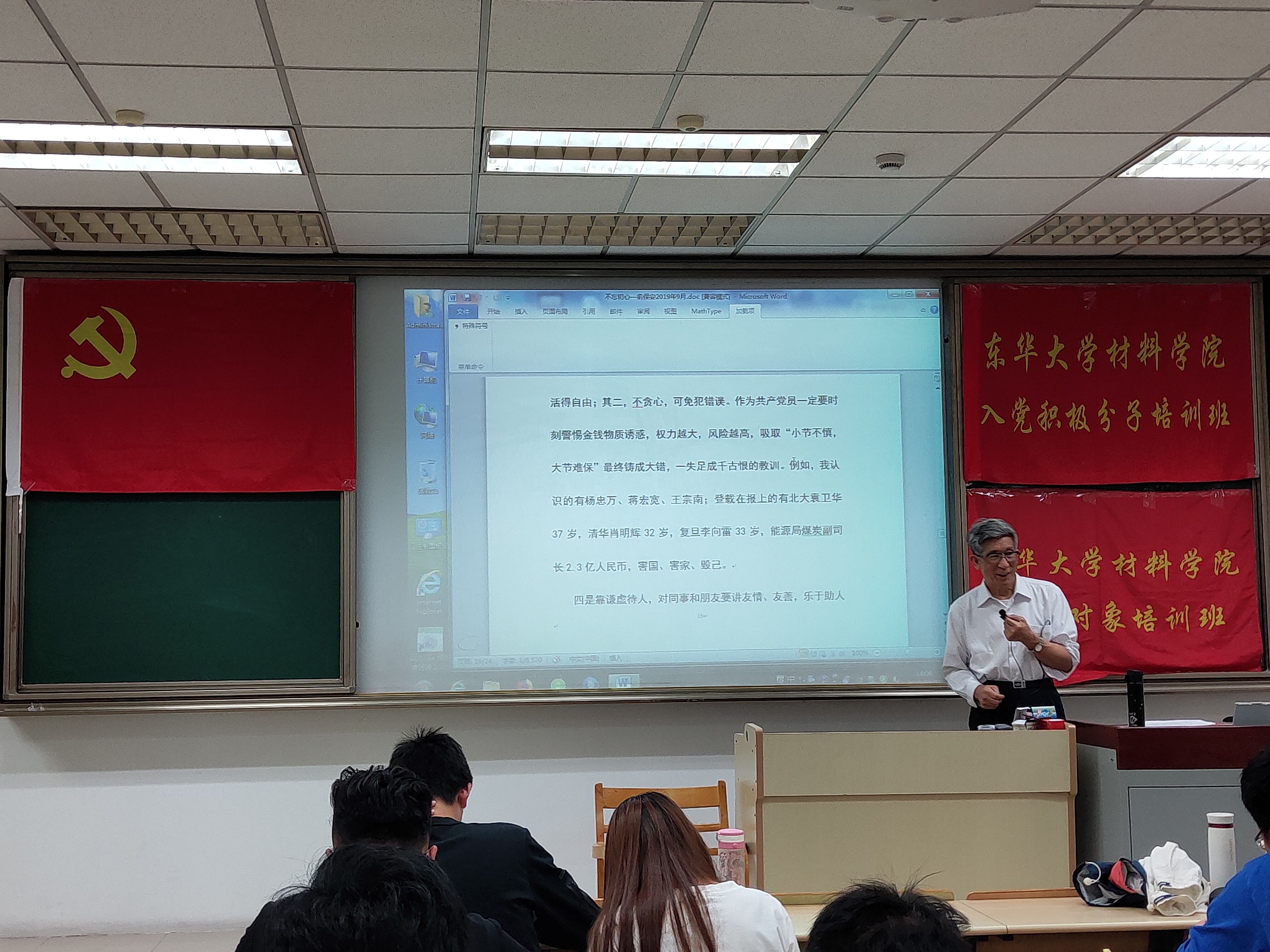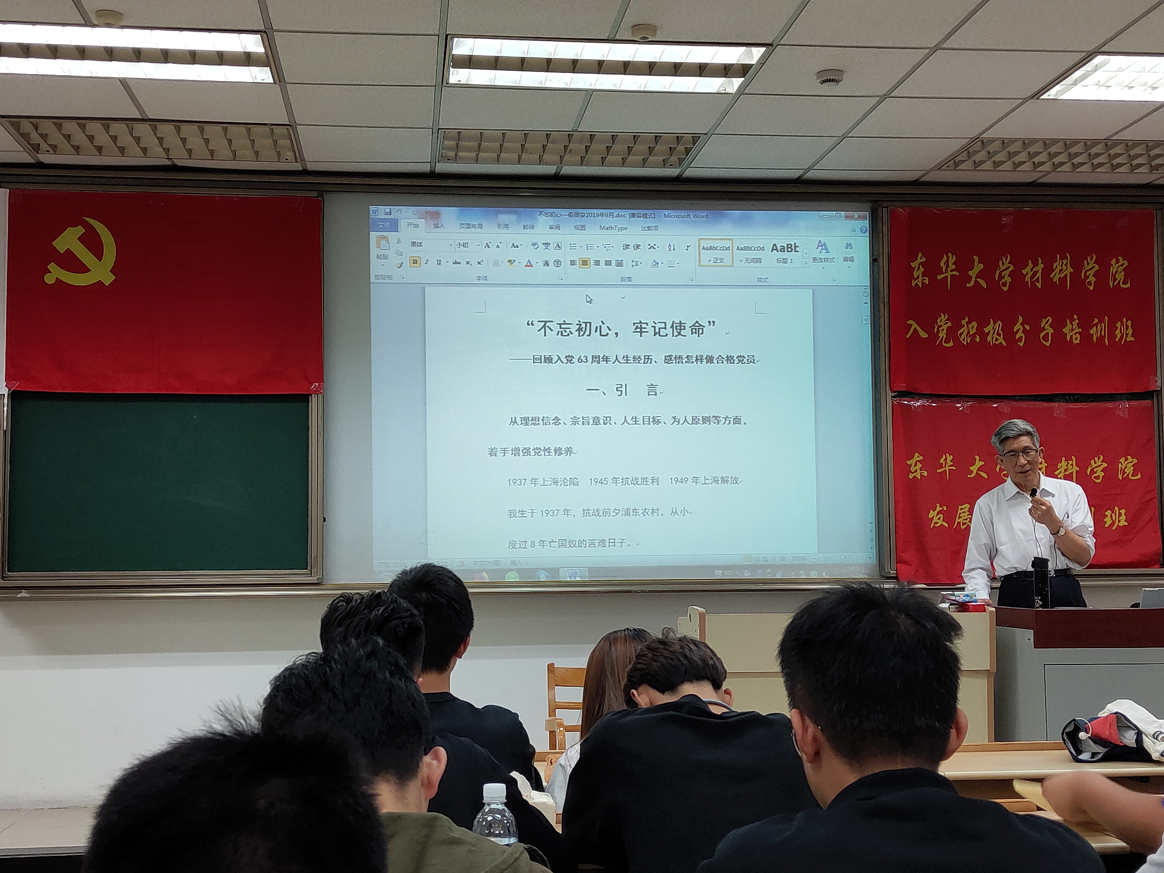 2019年10月22日下午13:00,william威廉中文官网2019年第二学期党校培训课程在松江校区1125教室举行,本次课程由材料公司党校主办,材料公司入党积极分子培训班学员、发展对象培训班学员以及信息、人文公司党校学员共同参与,主讲人关工委俞保安教授以“不忘初心 牢记使命——暨回顾入党63年人生经历 感悟怎样做合格党员”为主题开展专题讲座。