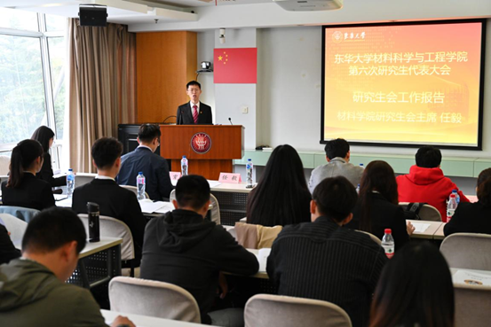 材料公司第十九届研究生会主席任毅对过去一年研究生会工作做总结报告,提出反思与展望。李杰同学回顾了过去一年中的研究生会工作,从“完善内部建设,加强政治引领”、“传承传统品牌,创新精品活动”和“发展公司优势,加强学术活动”等三个方面进行总结。探索和展望了今后材料公司研究生会工作的新思路、新方法,并希望新一届材料公司研究生会能够永葆蓬勃向上的青春活力,牢记使命,同心共进,砥砺前行。