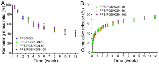 支架展现了良好的生物降解性,在降解过程中,促进软骨再生的生物活性小分子KGN被缓慢释放(图2),控释时间长达3个月以上。