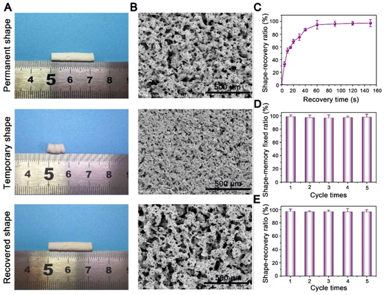 构筑的PPS/PGS/KGN三元支架展现了良好的体温形状记忆效应。较大的多孔支架可以被压缩固定到较小的紧凑状态,便于微创植入;植入体内后,在体温(37 ºC)下,支架自然恢复到设定的初始状态,修复组织缺损。该支架经过5个形状记忆过程后,仍保有98%的形状记忆固定率和97%的形状记忆回复率,并且其可定制成各种形状以满足不同的组织缺损需求。