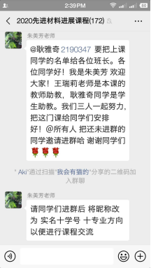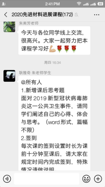 在第一堂云课上,朱美芳老师围绕课程主题,在传授知识的同时更加关心同学们和家人的身体健康情况,特别是身处湖北的同学们,鼓励他们主动分享所在地区的现状。如周昉同学在湖北,所在小区不允许出入,管制相对严格。在课堂上,朱老师还结合放弃疫情防控与个人之间的关系,新时代老员工如何面对新课堂等给予大家以指导。她说,当前疫情形式严峻,开学时间还未定,但是按照教学计划,现在已经属于上课阶段,因此,同学们从心态、作息等方面都要逐渐调整过来,即使在家,也要像在公司一样,做到有计划有规律地学习。通过交流,了解到多数同学,如岳美辰、李星浩等每天都会安排学习时间,坚持阅读文献,学习软件;还有的同学已经开始了课题组的工作。当然也存在作息还不规律的问题,还有同学在农村老家,网络信号不好导致学习条件不足,但也在积极想办法克服。老师的关心让身处不同省市的同学倍感温暖,学习的激情也跟着提了上来。一个半小时的课堂就这样在老师同学们你一言我一句地交流中结束了。会后,朱老师还不忘在群里感谢大家的配合,助教也总结反思了第一堂课出现的问题,为下次课做好更充分的准备。