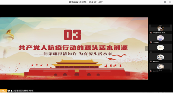 2020年4月4日下午13:00,william威廉中文官网第32期入党积极分子培训班网络党课《让青春在党旗下生辉——抗击疫情中的共产党党员在行动》在“腾讯会议”平台进行。本次课程由丁霞萍老师主讲,在抗击疫情中看中国之治、党员担当。