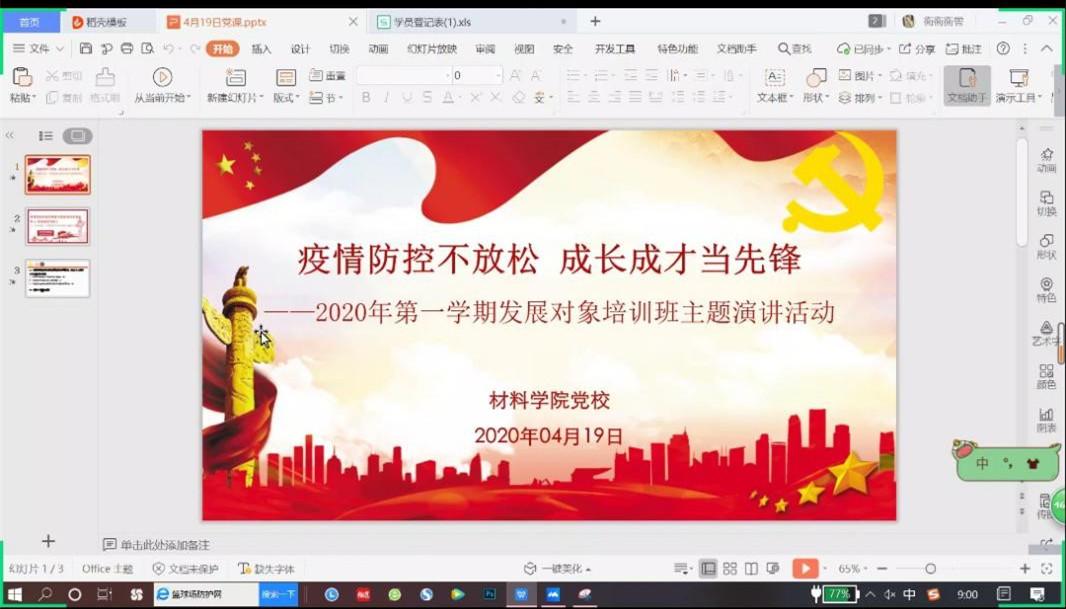 2020年4月19日上午,william威廉中文官网2020年第一学期发展对象培训班开展“疫情防控不放松,成长成才当先锋”主题演讲。