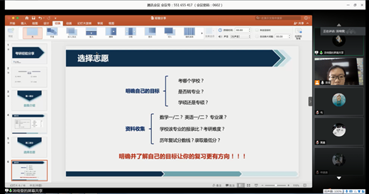 此次分享交流会持续近三个小时,同学们都在这场分享会中收获了自己需要的信息和学习方法,尽管在疫情期间同学们无法相见,但相信大家都会在家学习期间,调整好自己的学习状态,合理安排好自己的学习与生活,愿所有考研学子在今年年底一战成硕,成功考入自己理想的学府。