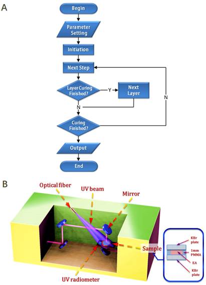 图 2. (A)光固化反应动力学计算模拟流程图; (B) 原位紫外光固化-红外光谱联用装置示意图。