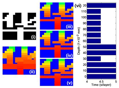 该工作模拟计算涉及逐层光固化交联反应以及氧阻聚机理,采用不同组分的光固化树脂与光引发剂对模拟结果进行验证(图3)。计算结果表明,固化条件设置对成型速度和质量有着显著的影响,动态切片以及自适应固化时间可在提升成型质量的同时减少所需时间(图4)。该工作为通用材料、模型的 3D 打印提供一种预览方法,可高效优化打印设置。