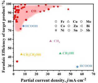 热力学上,CO2RR的主要还原产物的半反应的还原电势与HER反应接近。然而,CO2分子难以活化,还原过程又涉及多步电子转移过程造成了较低的CO2RR反应动力学。因此,开发高效的电催化剂是提高CO2RR反应活性和选择性的关键。单原子催化剂(SACs)成为催化领域的前沿研究,在多种催化反应过程中表现出优异的性能。目前,已有多种单原子金属催化剂被应用于CO2RR,并且得到了以CO为主的多种还原产物。