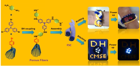随着人们对可穿戴智能电子产品需求量的不断增加,柔性可穿戴式器件以其轻质、柔韧、灵活和高效等特点受到人们的广泛关注。与块状和薄膜器件相比,纤维状储能器件因其独特的一维结构而表现出优异的柔软性、可编织性、变形适应性和透气导湿的特点,是最具潜能的储能器件之一。然而,目前所制备的导电纤维材料通常难以满足能量密度、功率密度以及机械性能兼具的要求,是该领域挑战性研究课题之一。共轭微孔聚合物(Conjugated Microporous Polymers, CMPs)是一类由全共轭高分子网络围筑、自具孔结构的新兴功能材料,通过分子设计可额外引入电活性官能团,可充分发挥双电层和赝电容两种储能基质,是一类具有高比电容和高循环稳定性的电极材料。然而,CMPs粉末不溶不熔,难以加工成纤维并制备得高性能纤维状超级电容器。