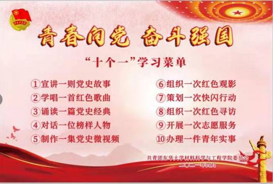 为推动党史学习教育在广大青年员工中持续升温,进一步提升团组织的凝聚力、战斗力和号召力,激发青年员工立大志、明大德、成大才、担大任,在五四青年节来临之际,材料公司面向公司全体青年开展“青春向党奋斗强国”主题教育活动。同时,发布“十个一”党史学习教育菜单,包括宣讲一则党史故事、学唱一首红色歌曲、诵读一篇党史经典、对话一位榜样人物、制作一集党史微视频、组织一次红色观影、策划一次快闪行动、组织一次红色寻访、开展一次志愿服务、办理一件青年实事,以“团队打卡+个人打卡”相结合的模式,让青年员工党史学习教育的“自选动作”更加接地气、有活力。