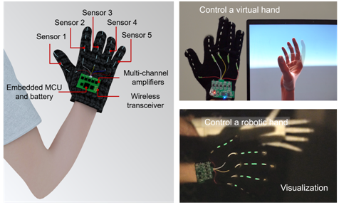 研究人员已成功将SOEFS用于智能交互手套(Smart Glove)的开发。Smart Glove利用嵌入式的微处理器提取并处理手套不同区域SOEFS产生的电学信号,实现了手势识别、AR交互、机械手操控等功能。同时,进一步利用SOEFS的光学协同反馈提高了手势判断的精准度,并达到了电学传感可视化的目的。