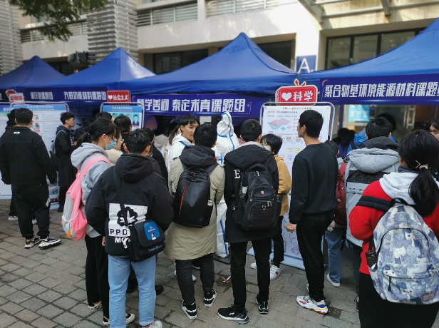 活动现场,在课题组展示区,蒙学善问泰定求真课题组、高性能纤维课题组、结构功能一体化新材料课题组、聚合物基环境能源材料课题组、聚酰亚胺材料研究中心、碳纤维课题组、先进功能材料课题组、功能材料与资源环境课题组以及功能弹性体课题组等9个课题组师生用生动的语言深入浅出地向参观同学进行介绍,全面展示了课题组长期以来的研究成果,既关注研究的科学理论,更强调产学研用的深度融合。展示内容包括柔性电子材料与器件研究、碳材料基柔性可穿戴传感器的研究、催化剂的催化转变、高容量有机负极材料及其全电池应用、功能导向共轭聚合物框架材料的设计与合成、仿生弹性体在生物医学领域的应用、材料界面调控及能源环境应用研究、贵金属纳米晶玻璃在光通信领域的应用、有机高性能纤维在消防服上的应用等多领域。先进功能材料课题组的李克睿老师表示,此次参与“材料日”展示,希望为低年级同学提供一个专业学习、科研启蒙和实践交流的开放平台,今后课题组也会持续加强与员工的互动交流,不断提升员工的专业技能水平和实践创新能力。