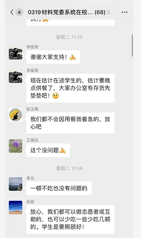 “刚开始公司进入准封闭管理,我觉得心理有点忐忑的,但是看到李耀刚老师每天和我们吃住在一起,还在朋友圈持续发布暖心推文,我的心情瞬间明媚起来”,罗加贝同学是先进功能材料课题组的一名成员,每天坐等李老师朋友圈更新已经成为了他和组内同学的一种习惯。“疫情,不能限制我们的深入思考”“师生要彼此成就”,看到李老师分享的正能量,看到他在评论中为每一位老师和员工加油打气,内心在疫情之下的不安也就随之消失了。把员工的冷暖时刻挂在身上,这样的育人文化早已根植于全体教师心中,“我们可以少吃几顿,员工们要照顾好”,这些自然流露的心声,滋养着育人初心,带给人阵阵温暖与感动。