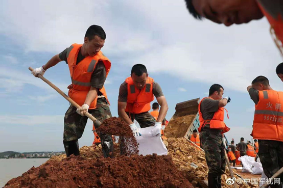 高鸣屿(左一)参与2020年鄱阳湖抗洪抢险任务