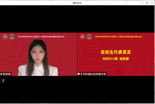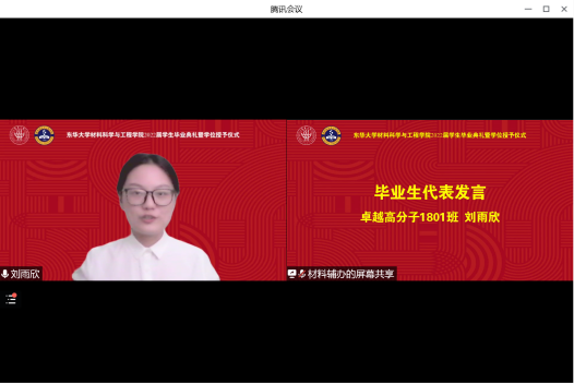 毕业典礼上,卓越高分子1801班刘雨欣、材料193硕周大旺分别作为毕业生代表发言。刘雨欣同学讲述了自己的大学四年由稚嫩变得更加自信、果断、踏实、坚定的成长蜕变,倡议同学们以德行为立人之本,以学识为发展之根,磨炼意志,求真务实,发扬“崇德博学,砺志尚实”的校训精神,以“东华青年”之名扬帆起航。周大旺同学在发言中表达了对母校和母院的感谢。从入学之初提供优化的课程体系和完整的实验设备,资助科研立项,组织学科交流,到读研期间导师以身作则、悉心栽培,再到毕业季搭建宽阔的就业平台以及严峻的疫情防控攻坚战中向春季毕业生们伸出温暖臂膀,集团和公司无时无刻的关心指导让他内心充满感动。他希望全体毕业生用求真务实,脚踏实地的态度实现人生理想,用成长和成才继续展现东华材料人的风采。材料212硕杨雨箫同学作为在校生代表发言。她感到,毕业生们严谨求知的学习精神、乐观向上的处事风格、求真务实的科学态度为全体在校生留下了宝贵的精神财富,她代表在校生立志以优秀的毕业生们为榜样,刻苦学习,脚踏实地,努力钻研,勇于创新,争取早日成才,肩负起为母校争光、为国家效力的重任,用青春和智慧续写辉煌的篇章。