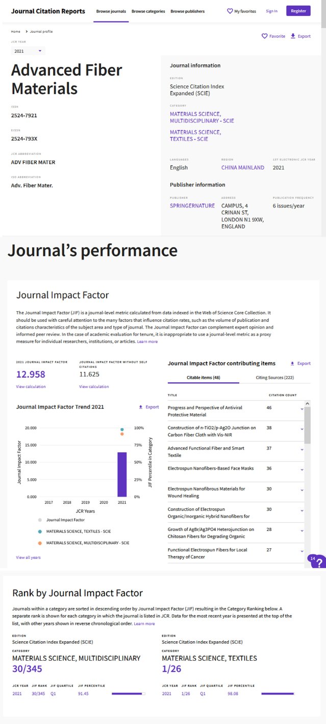 2022年6月28日,科睿唯安发布《期刊引证报告》(Journal Citation Reports,简称JCR)。Advanced Fiber Materials (先进纤维材料) 期刊获得首个影响因子12.958!在JCR材料学科(MATERIALS SCIENCE, MULTIDISCIPLINARY)中排名前10%,处于该领域Q1分区。