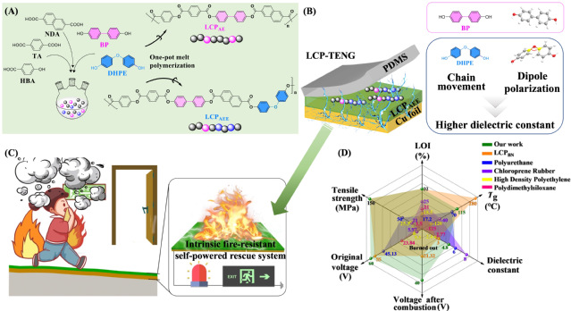 图型的分子结构设计与性能优势。(A)将4, 4'-二羟基二苯醚(DHPE)单体引入主链结构制得LCPAEE;(B)基于LCPAEE研制本征型阻燃LCP-TENG与(C)其在极端温度环境下的潜在应用展示;(D)LCPAEE与现有摩擦电聚合物的综合性能对比。