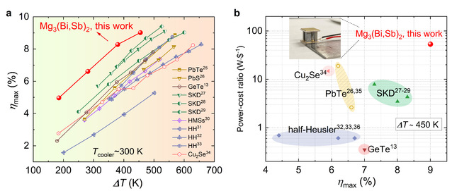 图1 (a) Mg3(Bi,Sb)2/CoSb3器件在不同温差下的转换效率与现有器件的对比; (b) 不同器件在温差为450 K时的发电成本效益和转换效率。