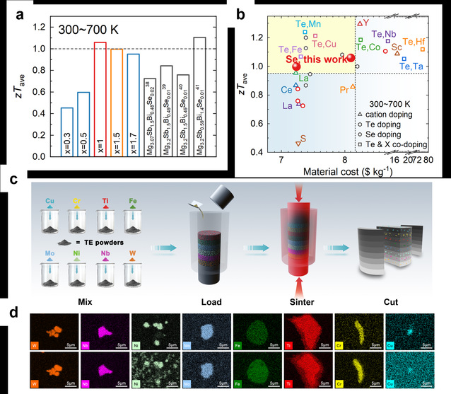 图2 n型Mg3(Bi,Sb)2材料性能与阻挡层材料筛选:(a, b) 平均zT及材料成本与文献对比; (c, d) 阻挡层高通量筛选方法及结果对比。