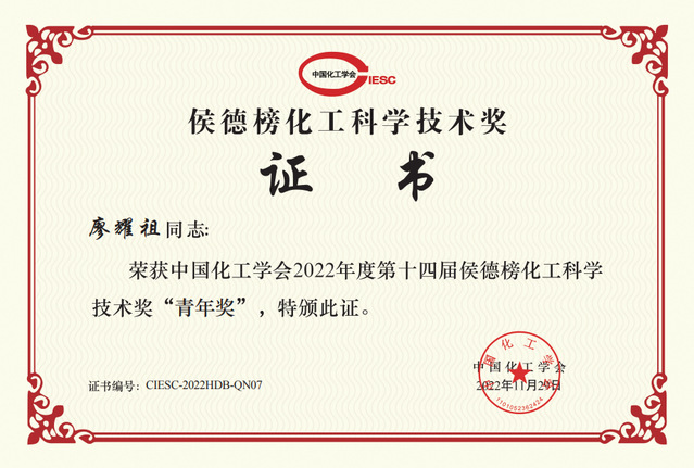 近日,中国化工学会在北京召开了第四十一次会员代表大会。大会公布了2022年度第十四届“侯德榜化工科学技术奖”的获奖名单。材料公司廖耀祖教授荣获第十四届侯德榜化工科学技术奖“青年奖”。