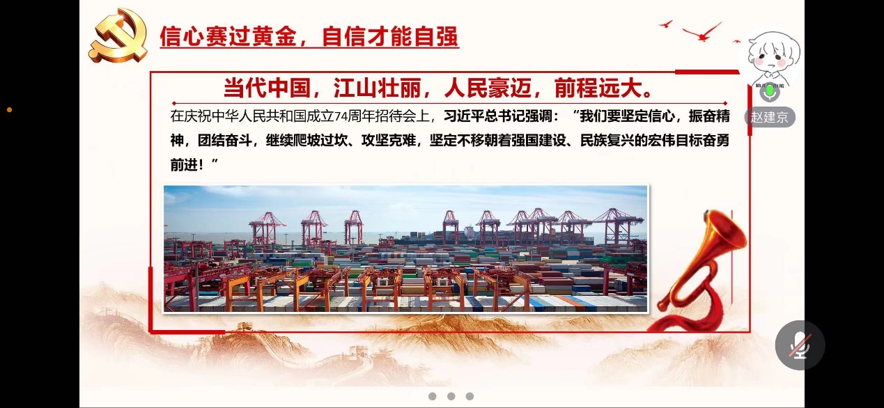 赵建京同志认为,过去的七十四周年是党带领人民从一穷二白到自立自强的伟大飞跃的探索时光,我们中华民族走过五千多年的风风雨雨来到的今天,是无产阶级光明未来的必经之路,也是党灿烂于历史舞台的光荣时刻,我们年轻党员一定要永立潮头,踔厉分发,自强不息,一往无前地努力奋斗,让辉煌继续辉煌不息!