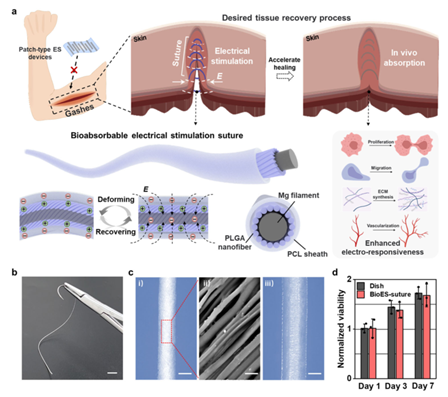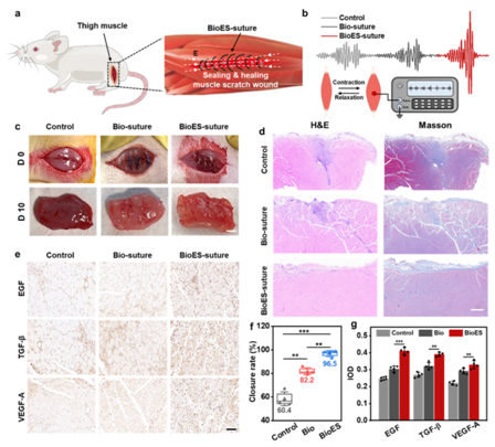 这种体内可吸收、自发电进行生物电刺激的新型手术缝线(BioES-suture)由生物相容的聚合物与金属材料通过多层同轴结构构成,不仅具备超越商用缝线的力学性能、在体内可安全降解和吸收,此外,该缝线在缝合部位微小的肌肉收缩-舒张过程中可产生伏级的生物电刺激,用于强化创面处内源性电场,从而实现了加速伤口愈合、降低感染风险的作用。这项工作展示了智能纤维在生物医学领域的应用潜力。