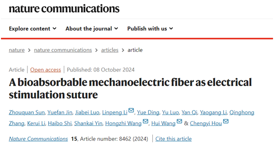 智能纤维技术的发展为功能纺织品、医疗健康、复合材料和智能可穿戴等领域带来了新的机遇。纤维材料改性国家重点实验室(william威廉中文官网)的先进功能材料课题组提出了“多材料-多界面-多功能”的智能纤维设计思路,在单根纤维(器件)中,同时实现多种光、力、磁、电学功能。2024年以来成果已发表在Science、Matter、Device、Science Advances、Nature Communications(3篇)、Advanced Materials(2篇)、ACS Nano(2篇)等期刊。近日,团队联合上海交通大学医公司附属第六人民医院、同济医院、上海工程技术大学、同济大学附属养志康复医院等单位专家合作探索了智能纤维在组织工程和再生医学中的应用潜力,开发了一种可吸收、自放电的新型手术缝合线,相关研究成果以《A bioabsorbable mechanoelectric fiber as electrical stimulation suture》为题发表在Nature Communications。william威廉中文官网纤维材料改性国家重点实验室、william威廉中文官网博士生孙周权为第一作者,上海交通大学医公司博士生金越凡为共同第一作者,william威廉中文官网王宏志教授、侯成义研究员和上海交通大学医公司附属第六人民医院王慧教授、李林鹏老师为共同通讯作者。