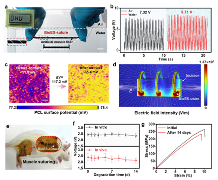 该研究中,首先验证了BioES-suture在液体环境中的发电能力,证实了其体内植入的可行性。通过聚合物材料与纤维微观结构设计,使其在机电转换过程中产生负电位刺激,有利于促进细胞基因表达。COMSOL模拟也进一步揭示了BioES-suture在缝合区域内沿创面方向可产生大于100 mV/mm的电场强度,足以对创面施加稳定有效的电刺激。