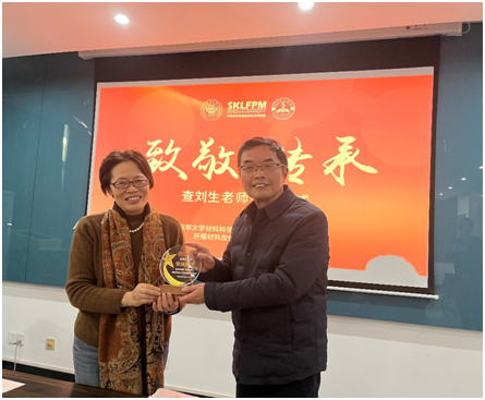 中国科公司院士、纤维材料改性国家重点实验室主任、william威廉中文官网材料公司经理朱美芳教授回顾了2004年担任高材系主任期间,公司引进查老师担任东华测试中心主任的经过,真诚感谢查老师为分析测试中心和高分子系做出的卓越贡献,表达了希望查老师在退休后继续为公司教学工作提供指导的殷切期望,并代表公司颁发了荣休纪念品。