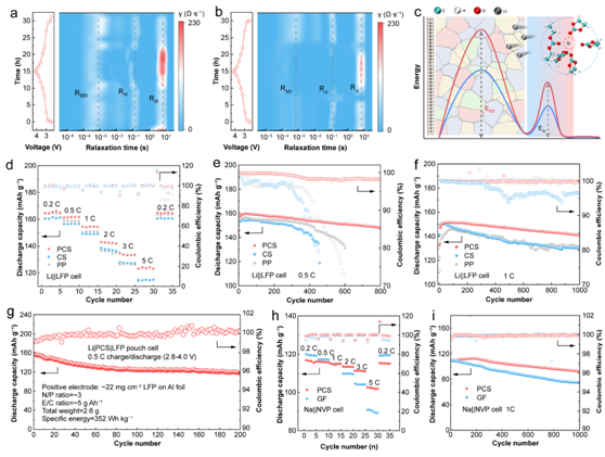 采用PCS的Li||LFP电池的DRT图谱显示出比CS更低的界面相传输阻抗(RSEI)和电荷转移阻抗(Rct),证实了PCS存在下比CS能实现更快的电荷转移,并形成更高导电性和更稳定的SEI。高介电常数隔膜的引入降低了碱金属的脱溶剂化能,从而减小了Rct;同时,富含LiF且低聚物含量少的SEI降低了RSEI。因此,装有PCS的Li||LFP以及Na||NVP碱金属电池展示出优异的倍率性能以及循环稳定性。
