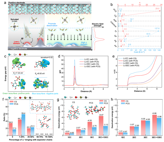 介电常数高达29.0的磷化纤维隔膜(PCS)可以促进碱金属负极的电场均匀分布,进而减缓尖端效应。此外,电场作用下高介电常数纤维的带脑子位移极化增强了电荷转移动力学并优化了溶剂化结构。在磷化纤维素链存在时,[Li(EC)3(DEC)]+从其溶剂化鞘中脱除EC和DEC分子的能垒(5.86 eV)低于纯纤维素链存在时的能垒(6.86 eV)。施加电场后,PCS链存在时的去溶剂化能进一步降至3.12 eV。相比之下,CS链存在时的去溶剂化能变化可忽略不计(6.47 eV)。这归因于电场作用下高介电常数的PCS在电场作用下发生强烈的电子转移,从而诱导Li+去溶剂化,这是影响电池性能的关键但尚未充分探索的因素。