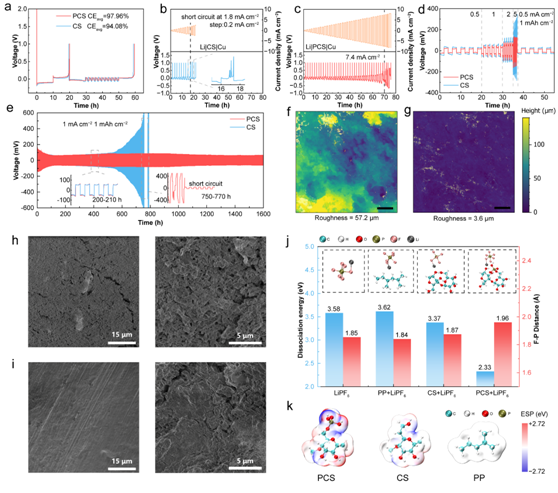 在高介电常数纤维隔膜的作用下,半电池展示出高库伦效率、稳定的沉积/剥离性能及优异的倍率性能,证实了高介电常数PCS赋予碱金属电池快速反应动力学。DFT模拟表明结果表明纤维素骨架中丰富的磷酸基团可能显著促进电荷转移,加速LiPF6解离生成LiF,这需要进一步精细探究以验证高介电常数纤维隔膜对电池界面化学组成的优化机制。