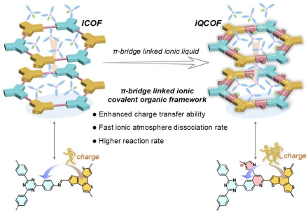 针对电极反应速度慢的痛点,团队开发出喹啉连接离子型框架材料(iQCOF)。通过分子结构精密调控(图三):引入三氮唑离子液体“锁住”阴离子,构建π桥提升电子“跃迁”效率,优化平面结构加速电荷流动,使材料获得407 mAh/g超高比容量,在10 A/g大电流下循环10000次后仍保持优异的能量密度,30秒快充不再是梦。该成果被《德国应用化学》以重要论文刊发(Angewandte Chemie International Edition, 2025, 202505207)。