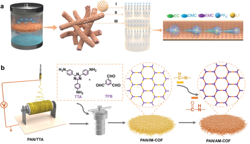 锂金属电池快充时,锂离子常“堵车”导致性能下降甚至起火。研究团队创新性地设计出一种分级共价有机框架多孔隔膜(PAN/AM-COF),犹如为锂离子修建了“立体交通网”。亲锂微孔通道:像智能闸门般精准筛选锂离子;分级联通孔道:实现3.33 mS cm−1超高离子电导率;热稳定性屏障:100 °C高温下仍能稳定循环300次。搭载该隔膜的磷酸铁锂电池,在30C超高倍率(约12分钟充满)下,每次循环容量衰减仅0.037%,为低空飞行器、急用医疗设备等极端场景提供可靠电源。相关成果发表于《先进能源材料》(Advanced Energy Materials, 2024, 14, 2401146)。