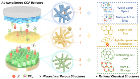 更令人振奋的是,团队首次提出全纳米纤维共价有机框架电池(ANCB)概念——用同类型纳米多孔材料同时制造电池的正极、负极和隔膜(图二)。这种“三位一体”设计带来惊人性能:能量密度达517 Wh/kg(接近顶级锂电池)、功率密度飙升至9771 W/kg(超普通电池十倍)、56秒完成超快充(极端电流环境)。“这相当于用造羽毛的材质,实现了钢铁的强度。”廖耀祖教授比喻道。该设计同步破解高能量与高功率不可兼得的难题,相关研究登上《ACS纳米》(ACS Nano, 2024, 18, 29189)。