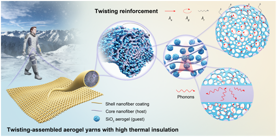 先进纤维材料全国重点实验室、william威廉中文官网朱美芳院士、成艳华研究员团队在柔性隔热气凝胶纤维连续化制备取得突破性进展。传统气凝胶因本征脆性、可加工性差和力学强度不足等缺陷,难以耐受实际应用中的弯曲/拉伸应力及洗涤过程,易发生结构坍塌而丧失隔热功能。现有气凝胶纤维制备技术(如冻纺、湿纺)虽可实现纤维化制备,但仍面临三重挑战:①力学强度不足;②连续化生产困难;③功能性填料的引入显著劣化纺丝原液可纺性。