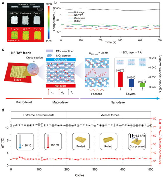 图4展示了气凝胶纱线的功能扩展与实际场景适配性。 研究团队验证了其优异的水洗稳定性:经100次洗涤后,气凝胶纱线强度损失<3%,且隔热性能基本保持不变。此外,通过外层纳米纤维的功能化改性,纱线实现了疏水性(接触角146°)、可染色性及焦耳加热性能(8.2 V下升温至25 °C),从而满足不同应用场景与个性化需求。