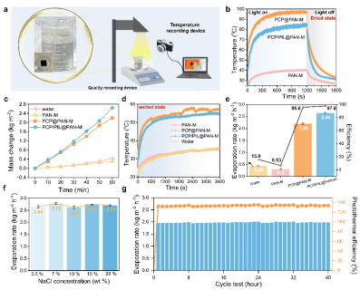 图3通过对比不同膜材料的表面温度、蒸发速率、光热转换效率与高盐浓度下性能表现,图中验证了PCP/PIL@PAN-M在1 sun照射下达到2.64 kgm⁻²h⁻¹的蒸发速率与97.6%的光热效率,且在20 wt%盐溶液中连续运行40小时无盐结晶,展现出优异的抗盐和运行稳定性。