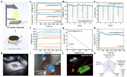 图5展现了构建于PCP/PIL@PAN-M上的热电系统结构、工作原理及输出性能,在太阳照射下实现最大功率密度1.5Wm⁻²,能稳定点亮小灯泡、驱动风扇,体现了该系统在海水淡化过程中同时实现能源回收的潜力,为“水-能”耦合系统提供示范模型。
