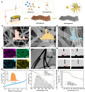 图2 展现了PCP/PIL@PAN-M纤维膜的制备工艺、SEM与TEM形貌、元素分布、水接触角测试、比表面积与热稳定性等特征,表明PCP和PIL在纳米纤维中均匀分布,显著提高了膜的亲水性、吸光率和结构稳定性,增强了整体蒸发性能。