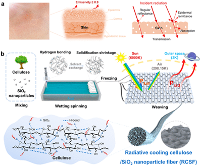 近日,william威廉中文官网、先进纤维材料全国重点实验室孔维庆/朱美芳课题组通过从人体皮肤的多层结构与热调节机制中获得灵感,设计了具有仿表皮褶皱结构的纤维素/纳米二氧化硅辐射制冷纤维(RCSF)(图1)。